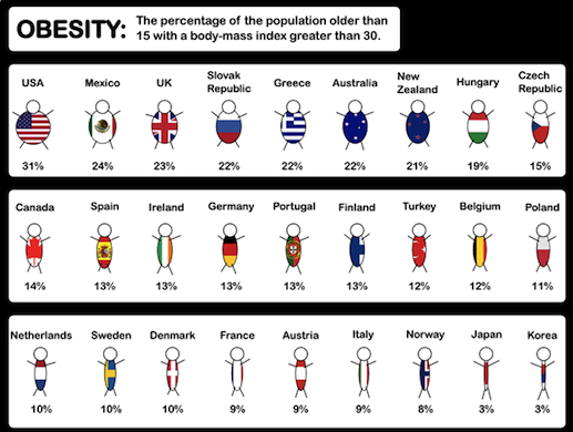 According to the National Institutes of Health, 66 percent of Americans are clinically overweight, while one in every three is obese. American's have the highest percentage of obesity in the world. They eat larger portions and are less physically active. Sweets, desserts, soft drinks and alcoholic beverages account for nearly 25 percent of all calories consumed by Americans. Healthy fruits and vegetables make up only 10 percent of caloric intake in the U.S. diet.